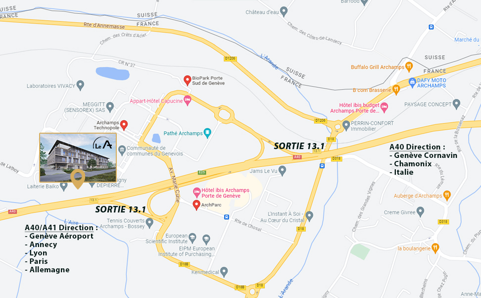 Visibilité exceptionnelle en bordure de l’autoroute A40. Facile d’accès et position stratégique pour les entreprises, à proximité de la frontière Suisse et des autoroutes A40 et A41 (accès Genève/Italie/Lyon/Annecy). Bus direction Genève/Saint Julien-en-Genevois (gare SNCF/SEVA), aéroport international de Genève à 20 min.